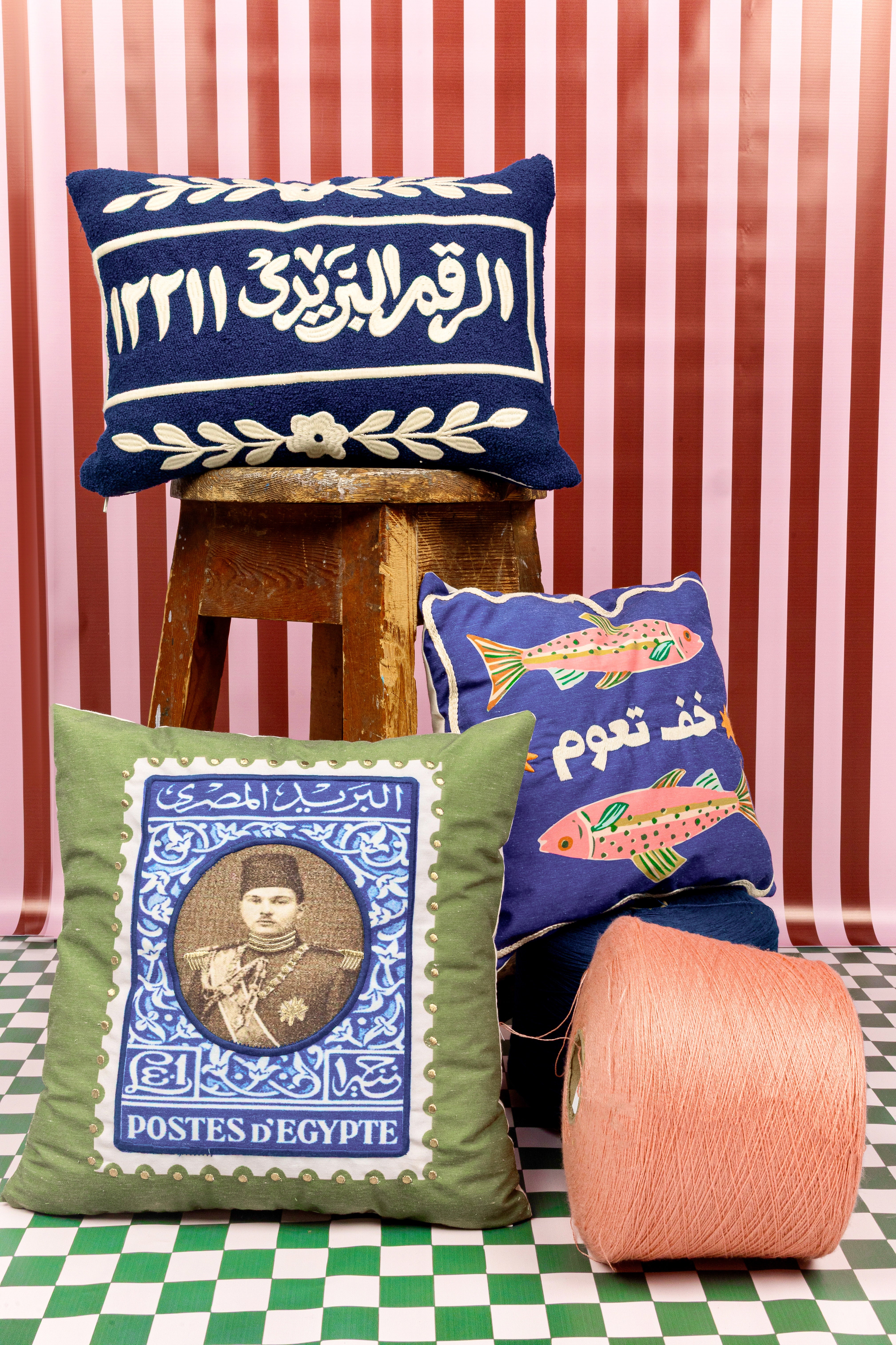 Immerse your space in Cairo's spirit with this unique cushion. This tufted design features the beloved city's name, "Cairo," rendered not in traditional Arabic script, but in a playful phonetic transcription using bold, deep blue Arabic letters on a crisp white panel. Framed by a striking dusty rose and vivid blue border, it offers a contemporary twist on Egyptian heritage. More than a decorative piece, it symbolizes a deep connection to cultural roots and the vibrant soul of this ancient city, adding flair to any room.